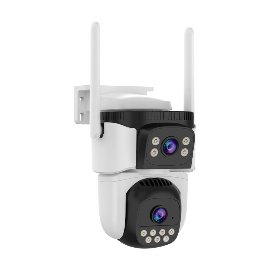 Управляема Dual-Lens Wi-Fi камера с 3MP резолюция, два обектива по 4mm (стационарен + управляем, 91° диагонален ъгъл). Pan 270°/Tilt 90° покрива широки зони без слепи точки. Dual Light нощно виждане до 30m (черно-бяло/цветно), IP66 за външен монтаж.